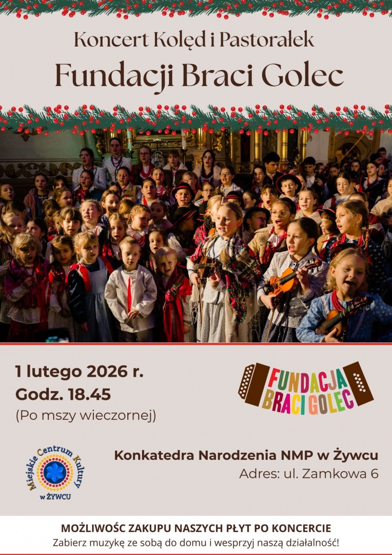 Zapraszamy na Koncert Kolęd i Pastorałek w wykonaniu podopiecznych Fundacji Braci Golec – blisko 150 dzieci i młodzieży z całej Żywiecczyzny zaprezentuje piękno bożonarodzeniowej tradycji.