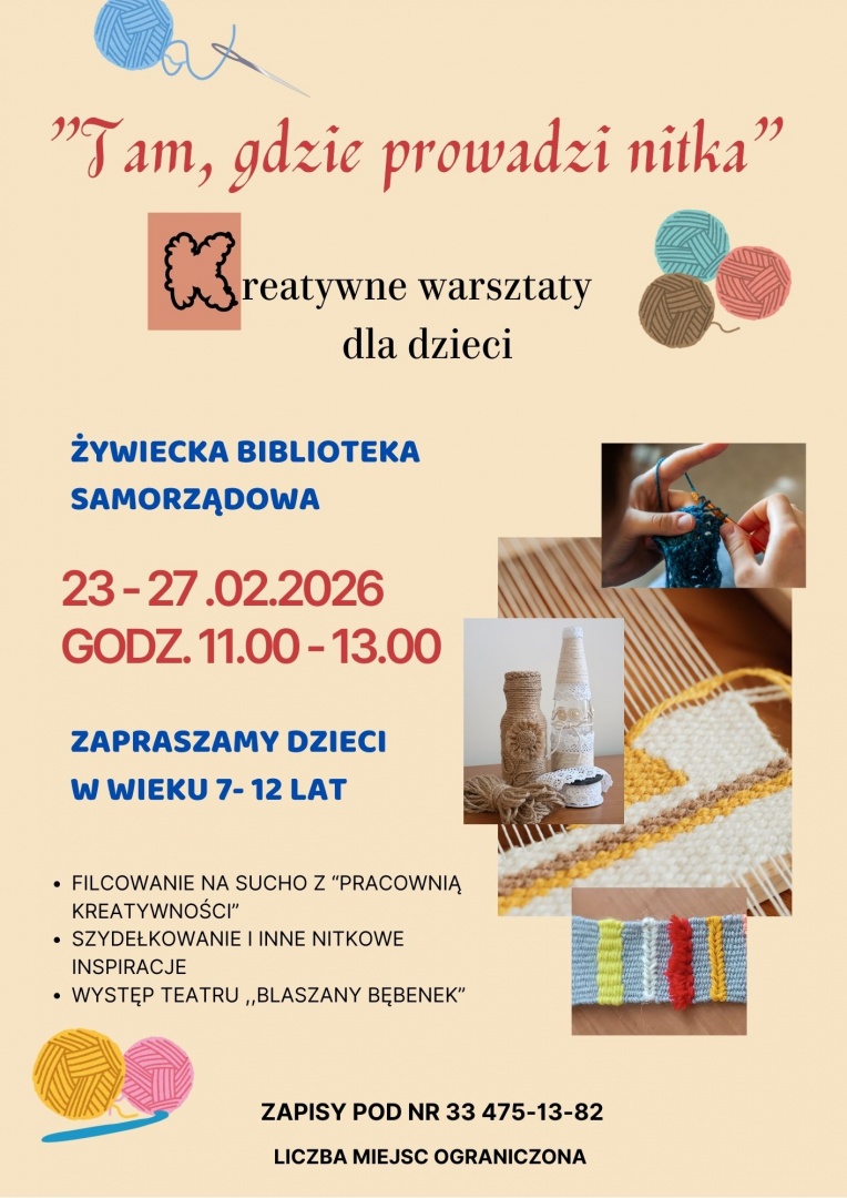 Zapraszamy do Żywieckiej Biblioteki Samorządowej na kreatywne warsztaty dla dzieci w wieku: 7 - 12 lat: „Tam gdzie prowadzi nitka”.