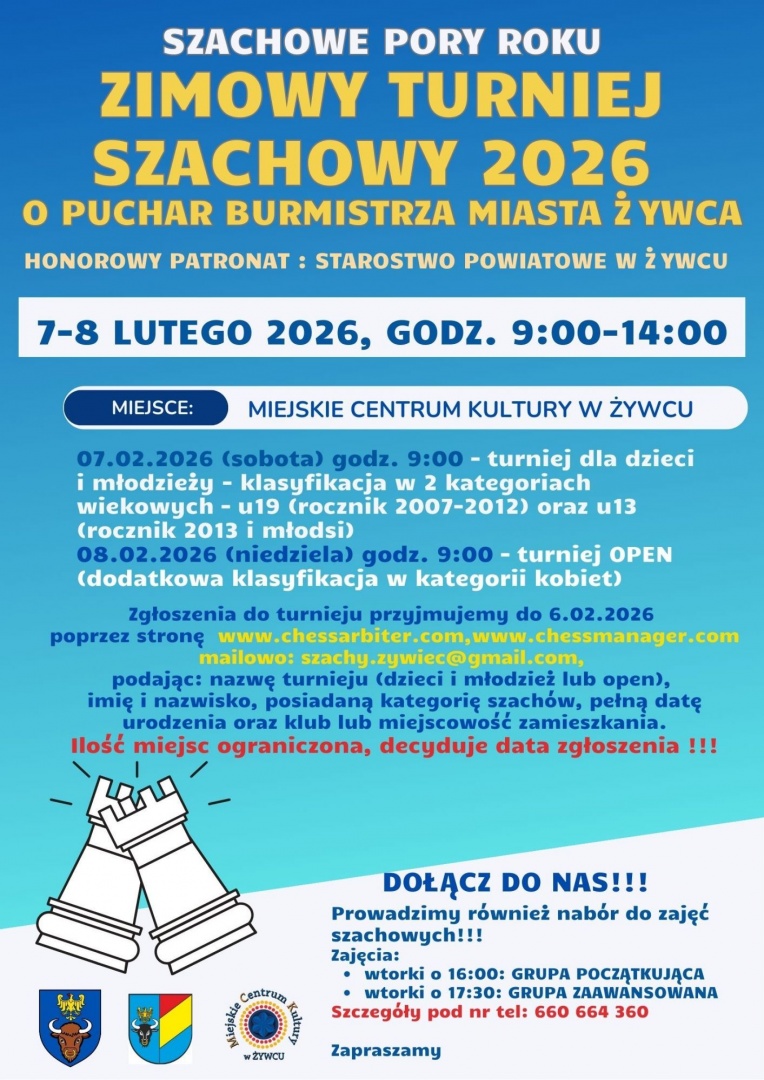 Zimowy Turniej Szachowy o Puchar Burmistrza Miasta Żywca 2026 odbędzie się w dniach 7-8 lutego 2026 r. w sali Miejskiego Centrum Kultury w Żywcu. Honorowy patronat nad turniejem objęło Starostwo Powiatowe w Żywcu.