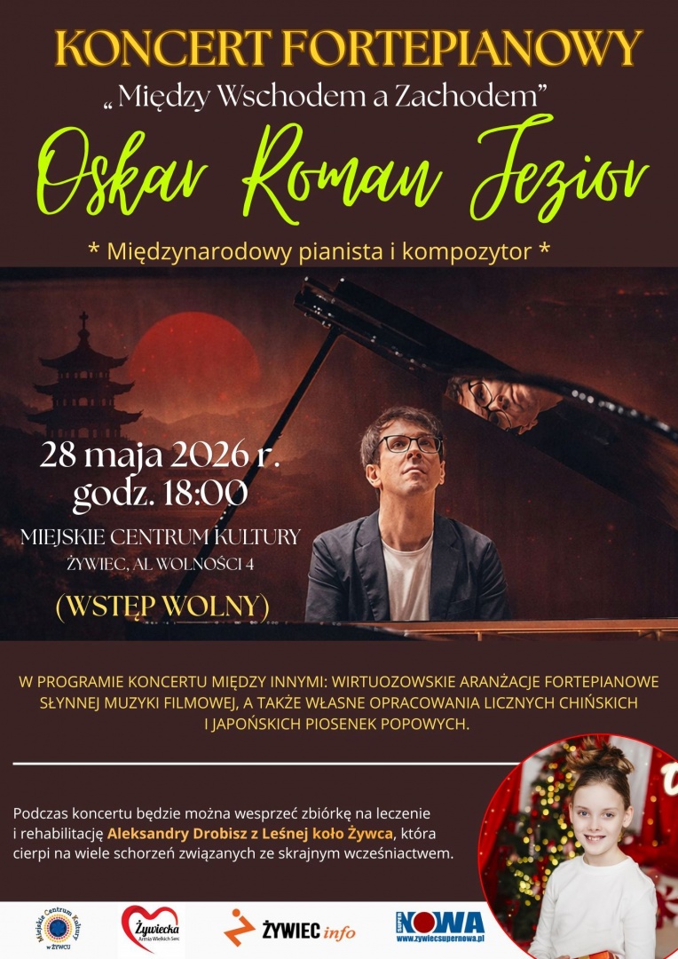 28 maja o godz. 18:00 zapraszamy do Miejskiego Centrum Kultury w Żywcu na spotkanie z wybitnym pianistą, Oskarem Romanem Jeziorem. Artysta zaprezentuje premierowy program, w którym wirtuozowskie aranżacje muzyki filmowej spotkają się z fascynującymi brzmieniami prosto z Chin i Japonii!