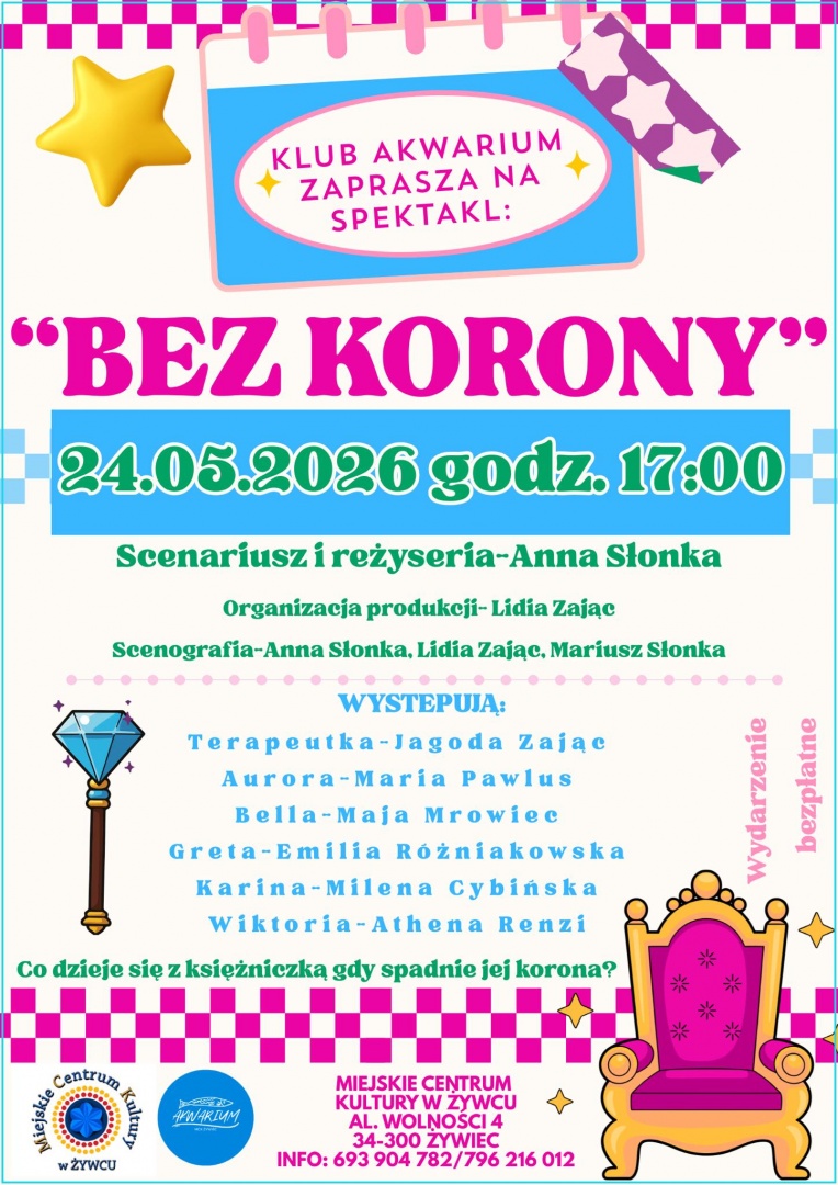 Miejskie Centrum Kultury w Żywcu oraz Klub Akwarium zapraszają na premierę spektaklu grupy teatralnej „Mała Scena” pod tytułem „Bez korony”, który jest efektem długiej, pełnej zaangażowania pracy młodych artystów.