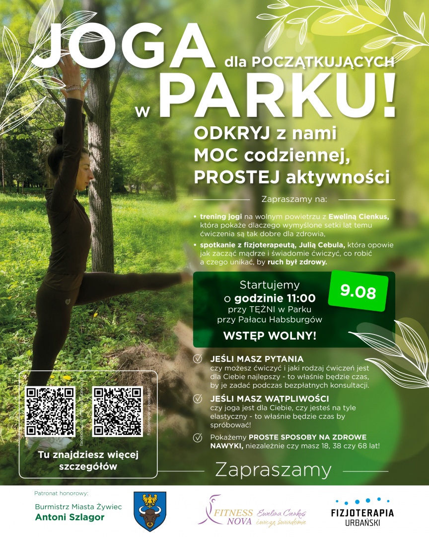 Serdecznie zapraszamy do udziału w bezpłatnym spotkaniu z jogą na świeżym powietrzu, które odbędzie się w sobotę, 9 sierpnia o godz. 11:00 przy Tężni w Parku Habsburgów w Żywcu.