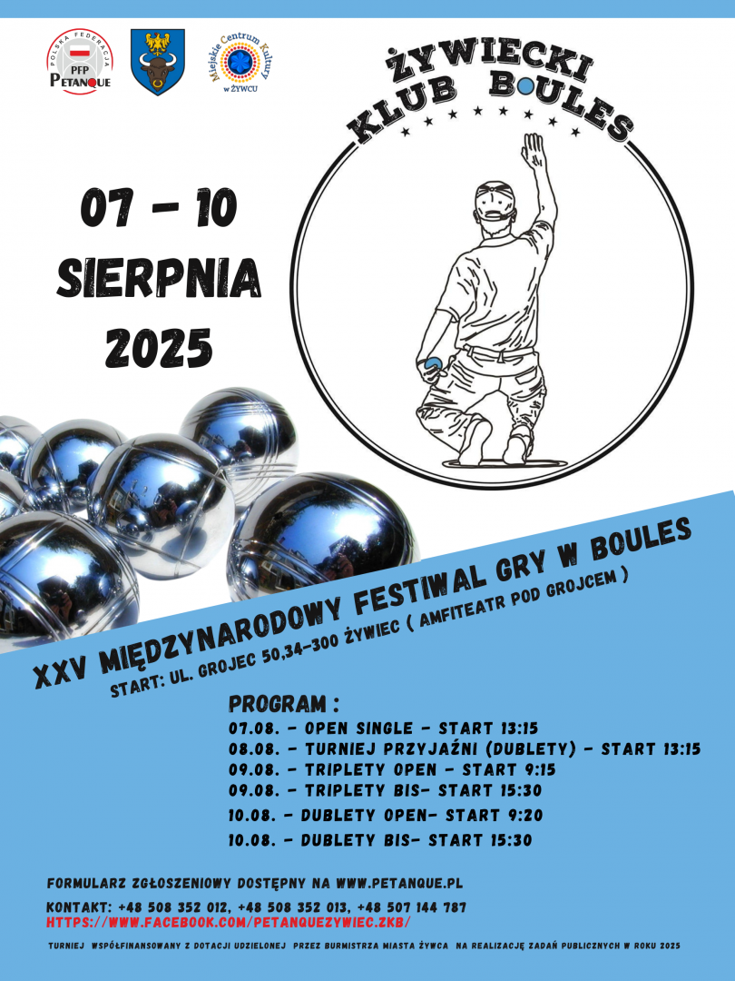 Żywiecki Klub Boules zaprasza na jubileuszową, 25. edycję Międzynarodowego Festiwalu Gry w Boules, który odbędzie się w dniach od 7 do 10 sierpnia 2025 roku. Zawody rozgrywane będą na boiskach przy Amfiteatrze pod Grojcem (ul. Grojec 50, 34-300 Żywiec).