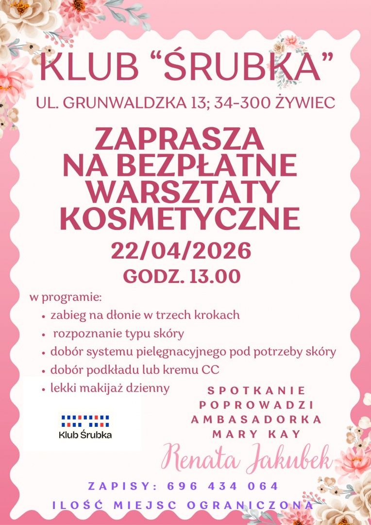 Zapraszamy 22 kwietnia o 13:00 do Klubu „Śrubka” na warsztaty z Ambasadorką Mary Kay, Renatą Jakubek. W programie przewidziano profesjonalną analizę skóry, dobór pielęgnacji oraz naukę lekkiego makijażu dziennego połączoną z zabiegiem na dłonie
