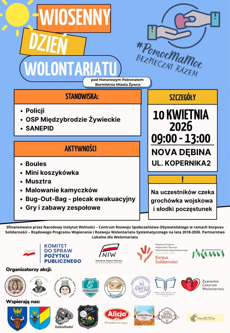 Zapraszamy na trzecią edycję Wiosennego Dnia Wolontariatu, która odbędzie się 10 kwietnia (piątek) w godzinach 09:00 – 13:00 w Novej Dębinie (ul. Kopernika 2).