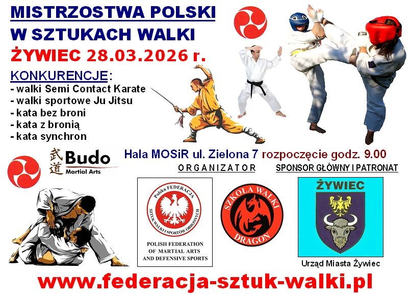 28 marca 2026 r. o godz. 9:00 zapraszamy do MOSiR Żywiec na Mistrzostwa Polski w Sztukach Walki. Będzie można zobaczyć w akcji najlepszych zawodników z całego kraju, którzy zmierzą się w widowiskowych dyscyplinach: walki Semi Contact Karate, walki sportowe Ju Jitsu, kata bez broni, kata z bronią, kata synchron.