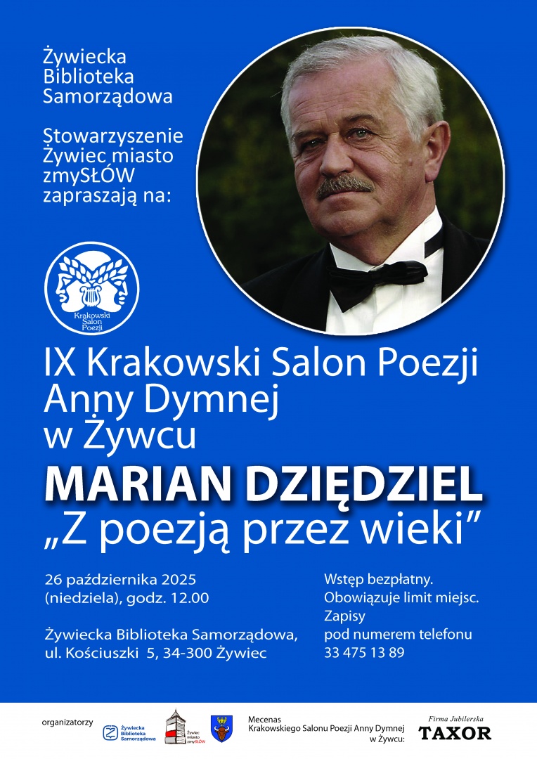 26 października – zapraszamy na IX Krakowski Salon Poezji Anny Dymnej w Żywcu. W tym roku wyjątkowym gościem wydarzenia będzie Marian Dziędziel, wybitny aktor teatralny i filmowy, którego niezapomniane role od lat zachwycają publiczność.