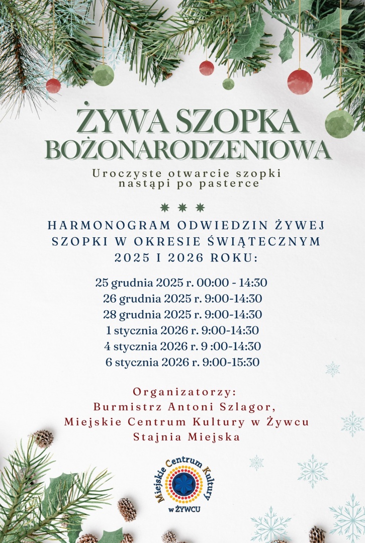 Zapraszamy do odwiedzenia Żywej Szopki Bożonarodzeniowej, organizowanej we współpracy z Miejskim Centrum Kultury w Żywcu oraz Stajnią Miejską Mini ZOO. Otwarcie szopki nastąpi po Pasterce, w Boże Narodzenie – 25 grudnia.